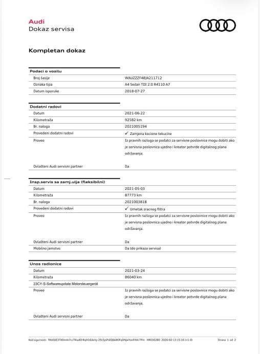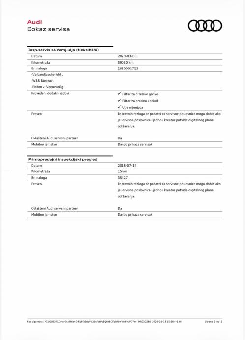 - Uredno servisiran i održavan po servisnom planu AUDI tvornice u ovlaštenom AUDI servisu