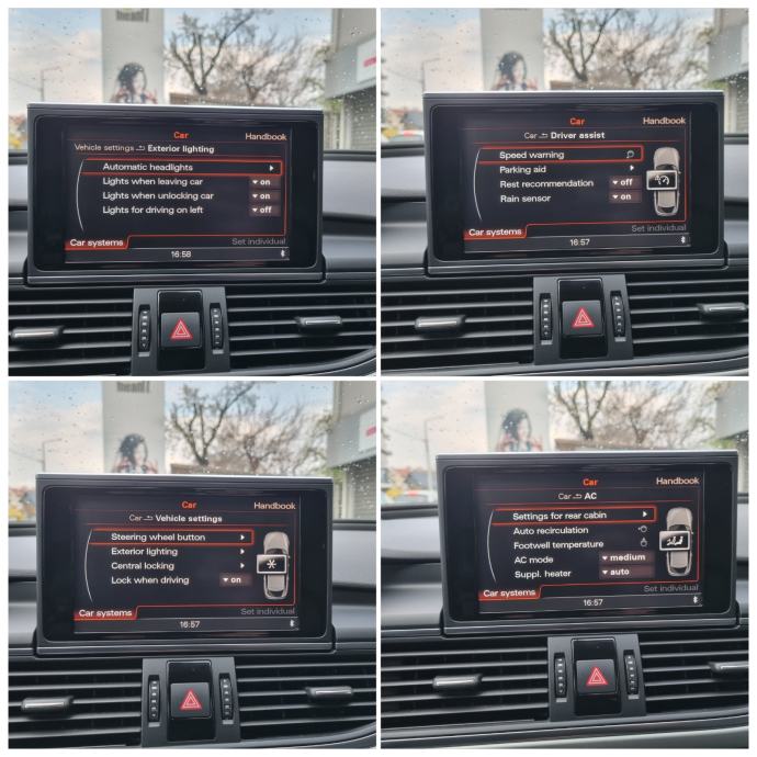 BUSINESS PLUS PAKET OPREME, METALIK BOJA, SVE U BOJI VOZILA, KROMIRANE UKRASNE LAJSNE OKO PROZORA, ALU FELGE S GOODYEAR GUMAMA, TONIRANA STAKLA, XENON SVJETLA + PRANJE FAROVA, PREDNJI I STRAŽNJI PARKING SENZORI, STRAŽNJA KAMERA, 4 X ELEKTRO PODIZAČI, ELEKTRO RETROVIZORI+ ELEKTRO SKLAPANJE RETROVIZORA, PROŠIRENO PUTNO RAČUNALO ( RADIO, NAVIGACIJA, BLUETOOTH, ITD.), SENZOR ZA SVJETLA, SENZOR ZA KIŠU, KOŽNI VOLAN + MULTIFUNKCIJE, AKTIVNI TEMPOMAT, KOŽNA SJEDALA + GRIJANJE SJEDALA, POTPORA U LUMBALNOM DIJELU SJEDALA, VELIKA NAVIGACIJA S PRIKAZOM SVIH DRUŠTVENIH SADRŽAJA ( PARKING MJESTA, DUĆANI, RESTORANI, BOLNICE, LJEKARNE, ZRAČNE LUKE, IGRALIŠTA, ITD. ITD..), AUDI MULTIMEDIA=( JUKEBOX, BLUETOOTH, HANDSFREE, SD CARD,DVD, ITD..., ), AUDI DRIVE SELECT ( 4 NAČINA RADA VOZILA= COMFORT, AUTO, DYNAMIC, INDIVIDUAL), AUTOHOLD, AUTOMATSKA DIGITALNA 3 ZONSKA KLIMA, NASLONI ZA RUKE PREDNJI I STRAŽNJI, TIPKOVNICA, BLUETOOH, HANDSFREE, KEYLESS PALJENJE VOZILA, GEPEK NA STRUJU, ISOFIX ( SUSTAV VEZANJA SJEDALICE ZA DIJETE), CENTRALNO DALJINSKO ZAKLJUČAVANJE S ALAROM, ORGINALNA 3 KLJUČA VOZILA, ITD. ITD....