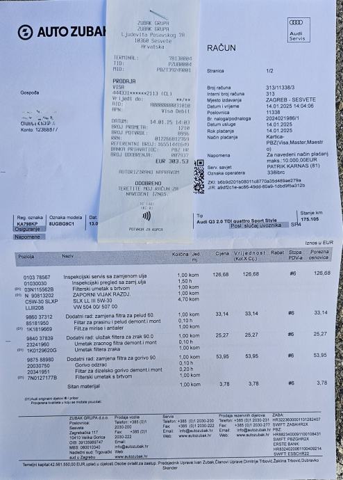 Svi servisi odrađeni u ovlaštenom AUDI servisu, posljednji odrađen 14.01.2025. na 175105km.