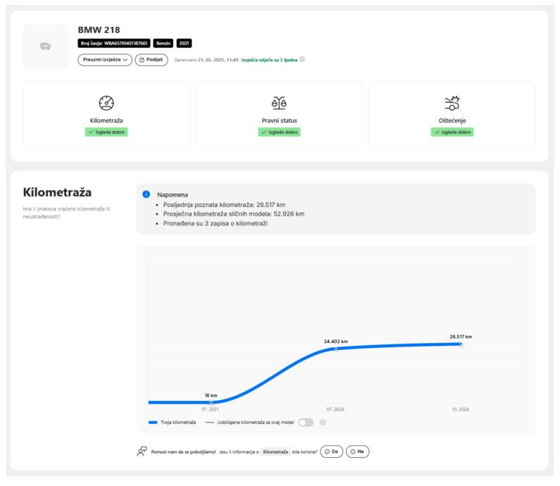 - Jamstvo na tehničku ispravnost vozila, prijeđene kilometre te podrijetlo vozila.