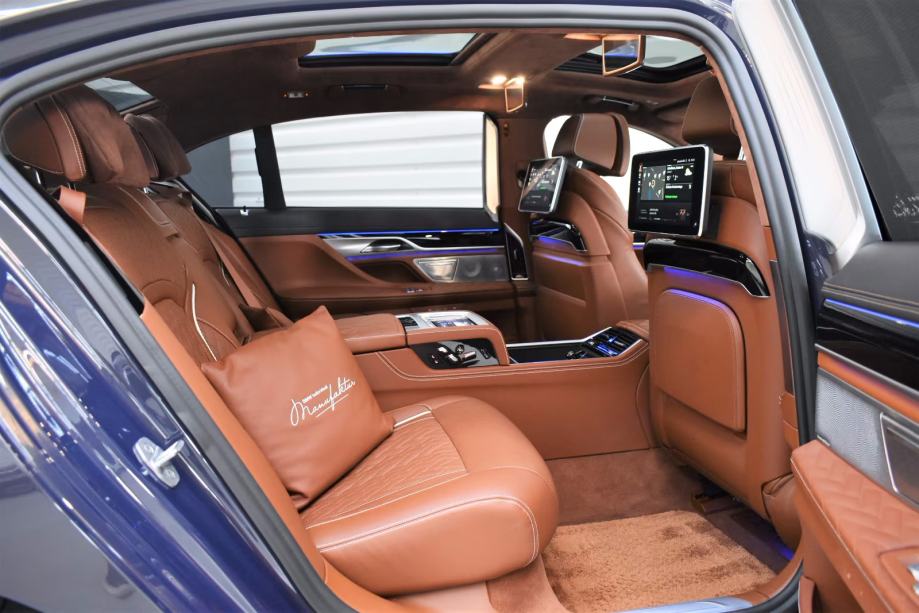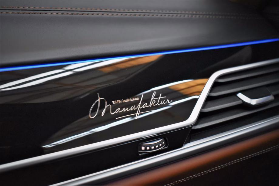 Paket ambijentalnog zraka, Paket opreme za Executive Lounge, BMW Drive Recorder (kamera na automobil), BMW Individual posebna boja u Frozen Arctic Grey Metallic boji, DAB tuner (digitalni radio prijem), Alcantara / Platinum stropna obloga (BMW Individual), BMW Night Vision sustav pomoći vozaču, Unutrašnjost: Individualne unutarnje obloge u piano završnoj obradi, Unutrašnjost: Keramičke aplikacije za komande, Unutrašnjost: Merino koža punog zrna, Individualni hladnjak, Sky Lounge panoramski krov (staklo, LED rasvjeta), Paket za pušače, Set za popravak guma (Mobility Pack), Prozori za zaštitu od sunca (zatamnjeni stražnji), Bowers & Wilkins zvučni sustav, TV Plus funkcija s navigacijskim sustavom, Paket za toplinsku udobnost