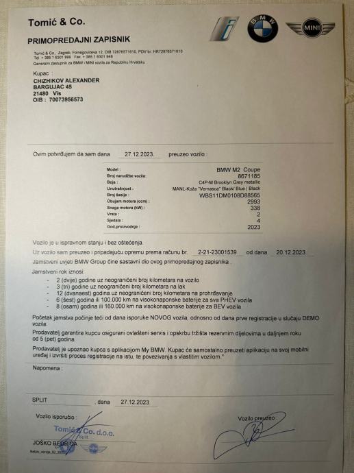 Dobar dan,na prodaju BMW M2.U prometu od 27.12.2023.godine dakle 2 godine je star,praktički nov.Prešao je 14542km,uvijek garažiran.Zaštitna folija je preko cijelog auta.Sive je boje,najbolja moguća oprema je u njemu koja se mogla nabaviti.Nalazi se u Splitu,nikad udaren,bez ogrebotina.Vozilo u tvorničkom stanju,kupljen preko autokuće Tomić.Jamstvo traje još 3 godine.BMW servisni paket 5 godina.Prometna vrijedi do 13.12.2026.Zainteresirani mogu nazvati na broj 0976985093.