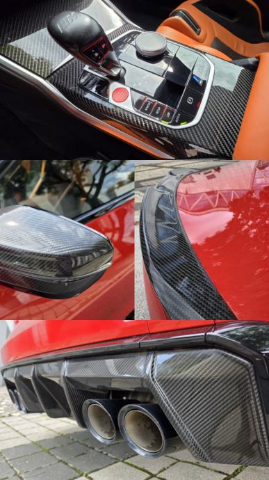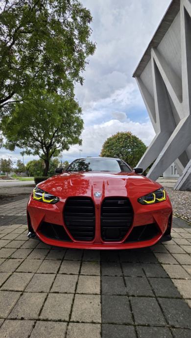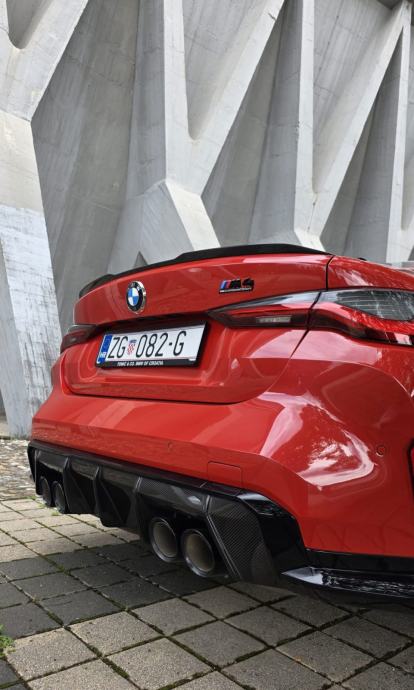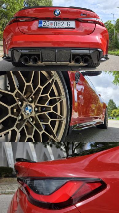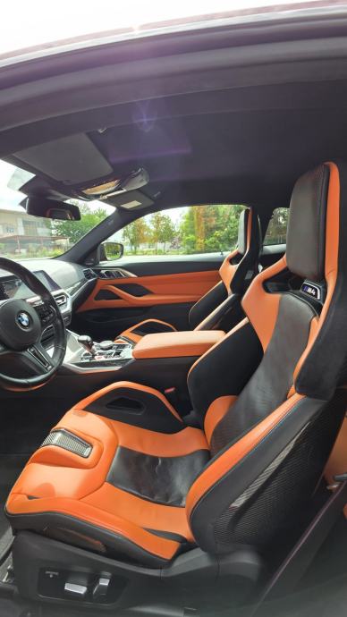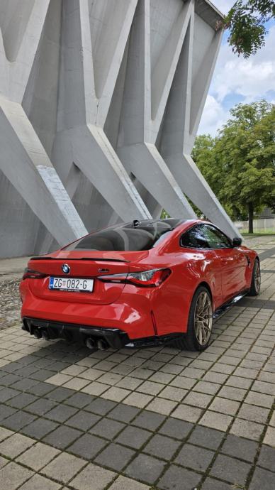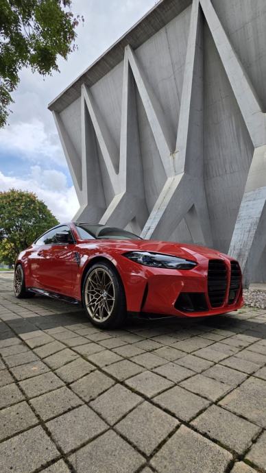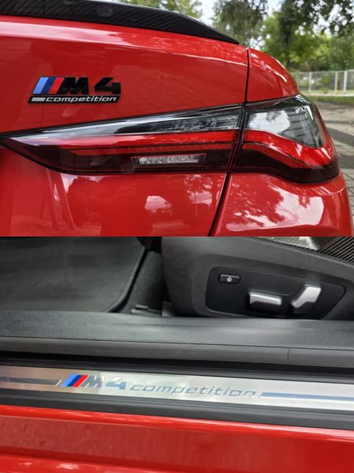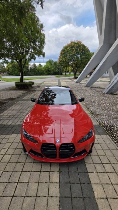 BMW M4 Competition xDrive (model G82), atraktivna boja TORONTO RED, carbon bucket seats, 11/21. Vozilo je u vrhunskom stanju, uredno održavano i servisirano isključivo u ovlaštenom BMW servisu (el. Servisna evidencija). Registirano još godinu dana, uključujući kasko osiguranje.