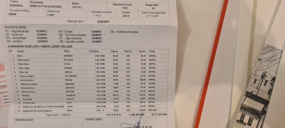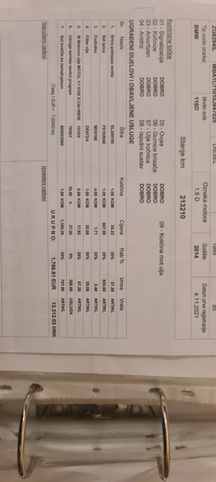 Na 213 tisuća je napravljen veliki servis, zamjenjen lanac, plus zamjenjen set kvačila sa zamašnjakom kao što je predočeno na slici računa iz servisa.