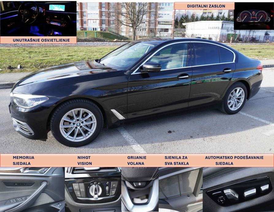 Ovaj impresivni BMW Serije 5 iz 2018. godine (VIN: WBAJD11090B196860) dolazi u ekskluzivnom Luxury Line paketu, koji ističe eleganciju kroz kromirane detalje eksterijera, premium materijale i sofisticirani dizajn. Sa snažnim dizel motorom i xDrive pogonom na sva četiri kotača, nudi dinamičnu vožnju uz nisku potrošnju i emisiju CO2 od samo 132-142 g/km.