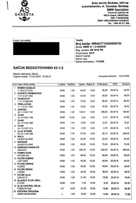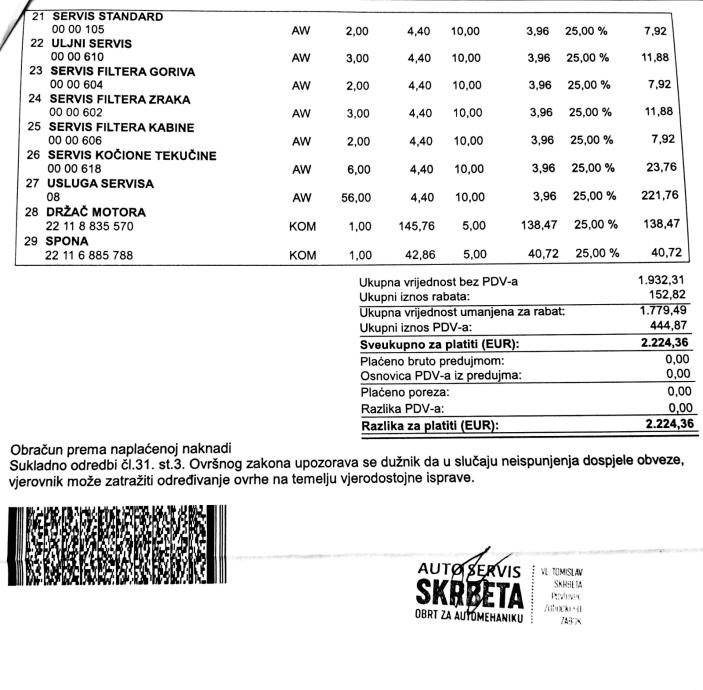 Nedavno napravljen veliki servis (zadnje dvije slike - račun, ukupno skoro 2.300 €)