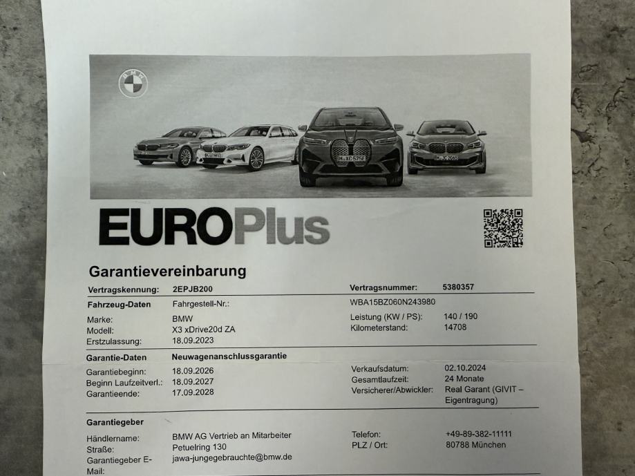 Prodajem izuzetno očuvano, uredno i atraktivno vozilo BMW X3 xDrive20d sa M-SPORT paketom opreme, pogonom na sva 4 kotača i automatskim mjenjačem. Automobil je kupljen od drugog vlasnika – ZAPOSLENIK BMW-a (prvi vlasnik BMW – Bayerische Motoren Werke) te je uredno održavan i servisiran u ovlaštenom BMW servisu u Njemačkoj. Datum prve registracije vozila: 18.09.2023 (REDIZAJN MODEL)