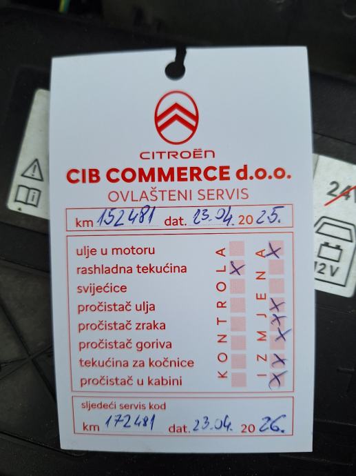 Zadnji redovni servis u Citroen Cib Comerce u V. Gorici 23.04.2025.,vrijednost servisa 400 eura,ulje u motoru, sva 4 filtera, ulje u kočnicama, neke gumice i pregled.