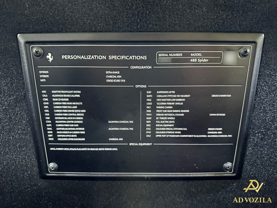 Važnije informacije: Carbon, lift sistem, stražnja kamera, grijanje sjedala, launch control, bi-ksenonska prednja svjetla, cerada Ferrari, servisna knjižica...