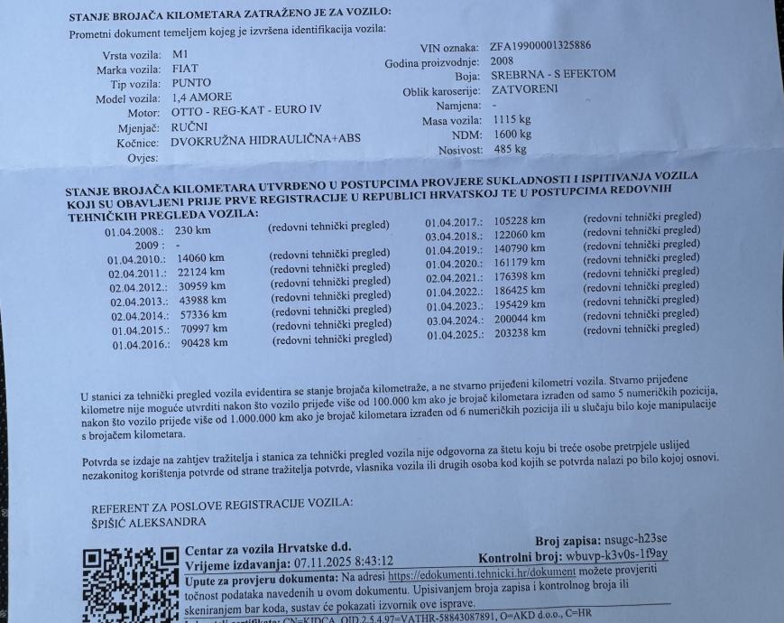 Ispis kilometraže sa tehničkog pregleda od prvog dana