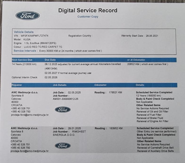 Zadnji servis je bio 2.5.2025 na 178.521 km (ulje,filter ulja,goriva,zraka,ulje u kočnicama)