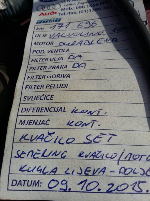 Prije godinu dana promjenjeno kvacilo, seleni, vodena pumpa sa zupcastim remenom, manzete letve volana, manzete kotaca, kugle, ulje i svi filteri. Prije dva dana stavljen novi cilindar kvacila.