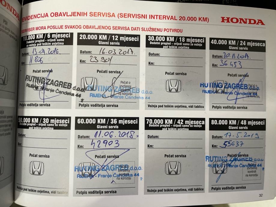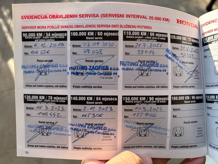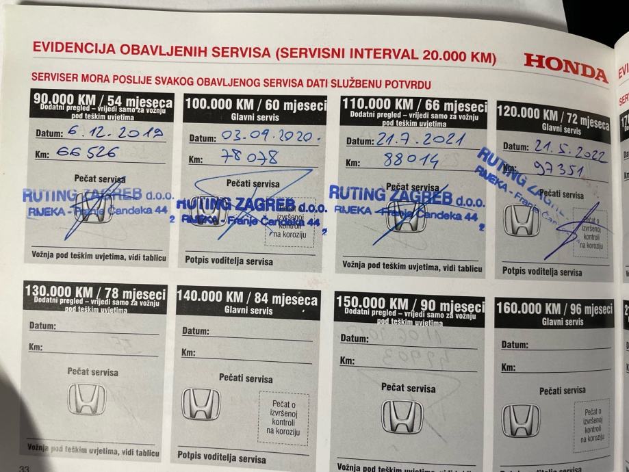 Od prvog dana garažiran, mažen i pažen. Kilometraža je izuzetno mala jer u obitelji imamo uvijek 2 Honde. Na tehničkom se mogu provjeriti svi kilometri ... 128.000 km trenutno