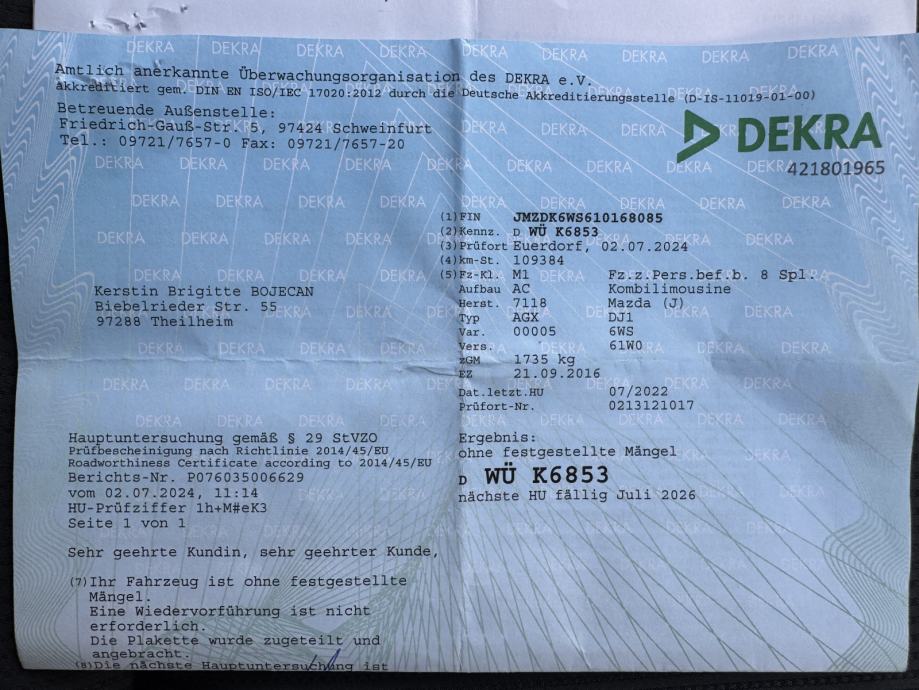 Originalne MAZDA aluminijske felge R16, LED svjetla, Svjetla za maglu, Parking senzori otraga, Start Engine Stop paljenje vozila na tipku, Klima uređaj, Grijanje prednjih sjedala, Multifunkcionalni upravljač s komandama, Tempomat, Pretinac i držač pića naprijed, Središnji naslon za ruku u koži naprijed, Putno računalo, Senzor kiše, Senzor svjetla, Senzor za tlak u gumama, Električno podešavanje ogledala, Električno sklapanje vanjskih ogledala, Električni podizači stakla naprijed, Upravljač podesiv po visini, Prednja sjedala podesiva po visini, Utor za USB, Utor za AUX, Utor za SD karticu, Mogućnost spajanja na Bluetooth, NAVIGACIJA, Radio CD mp3, Glasovno biranje, ISOFIX standardizirane kopče za dječje sjedalo, Child lock sigurnosni sustav, ESP (sustav za sprečavanje proklizavanja kotača), ABS (sustav protiv blokiranja kočnica), Daljinsko centralno zaključavanje, Dupli ključevi, Airbag paket zračnih jastuka (vozač, suvozač, bočni...), Putno računalo, Ručica mjenjača u koži, 6 brzina, Pokazatelj smjera u retrovizorima, Kožni servo upravljač, Električna kontrola stabilnosti, Start stop automatic, Djeljiva stražnja klupa, Električno izravnavanje svjetla, Smart City Brake Support (sustav pomoći vozaču – automatsko kočenje u slučaju opasnosti udara u vozilo ispred), Lane Departure Warning sustav upozorenja na nenamjerno napuštanje prometne trake, Zatamnjena bočna i straćnje staklo…