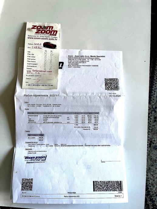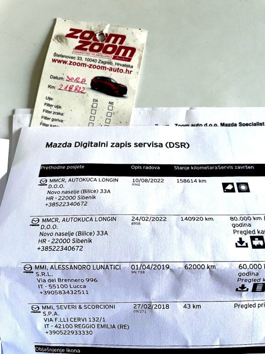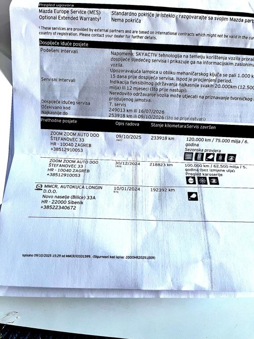 Na vozilu obavljen veliki servis te su postavljene zimske gume i diagnostika kotaca. Novi akumulator i novi difernecijal je na autu te je sve obavljeno u ovlaštenom Mazda servisu sa računima i garancijom čime je budući kupac oslobođen velikih i skupih investicija koje su uobičajene za vozila s ovom kilometražom.