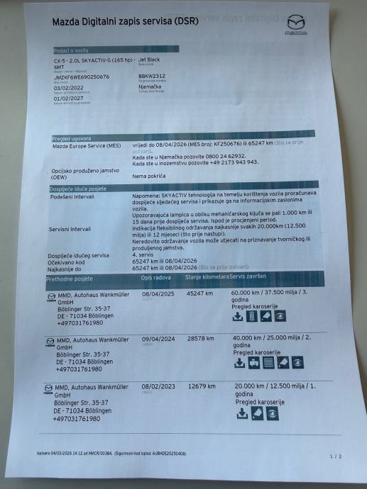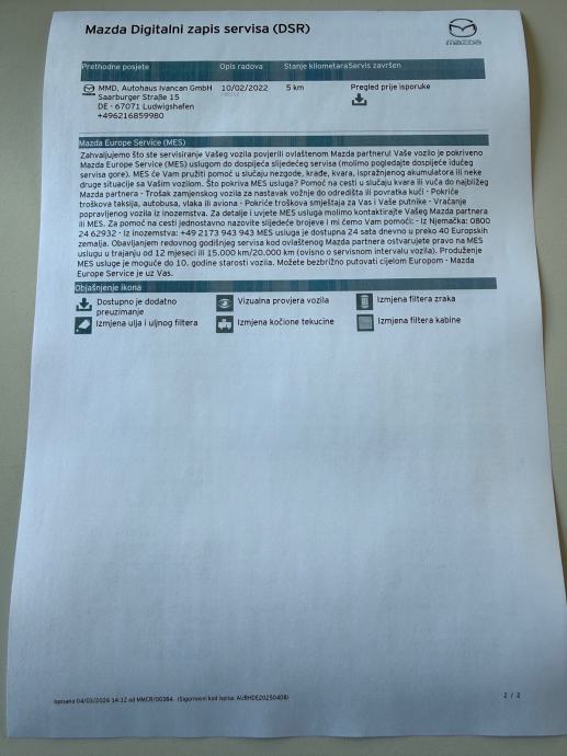 Motor redovito servisirana prema planu održavanja u ovlaštenom Mazda servisu