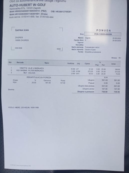Vozilo posjeduje elektronsku Mercedes servisnu knjižicu. Na autu je upravo izvršena zamjena ulja u mjenjaču, kao i karter ulja sa filterom. Na autu je prva boja. Vozilo nikada nije sudjelovalo u prometnoj nesreći, niti je lakirano. Auto je registriran godinu dana.