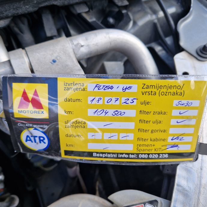 Servis vozila napravljen na 104500 km, zamjena ulja i svih filtera, nove pločice te čiščenje klime.
