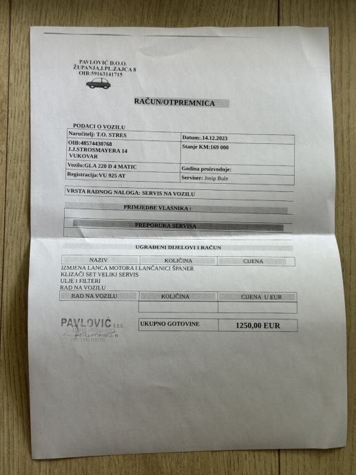 Na autu je na 170 000km napravljen veliki servis, gdje je zamijenjen lanac, lančanici, klizači i španeri te je sve skupa s malim servisom plaćeno 1250€ (prilažem račun).