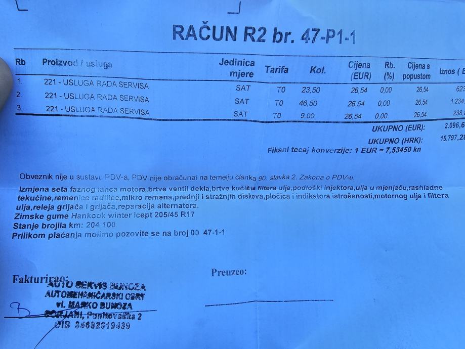 Auto u odličnom stanju! Na 205 tkm izmjena lanca,lančanika,reparacija alternatora,reparacija injektora...prilažem račun! Još je dodatno zamjenjeno kvačilo!