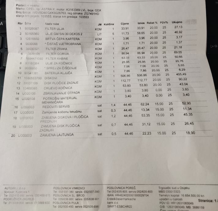 Vozilo je redovito servisirano u ovlaštenom Opel servisu Will u Zagrebu.