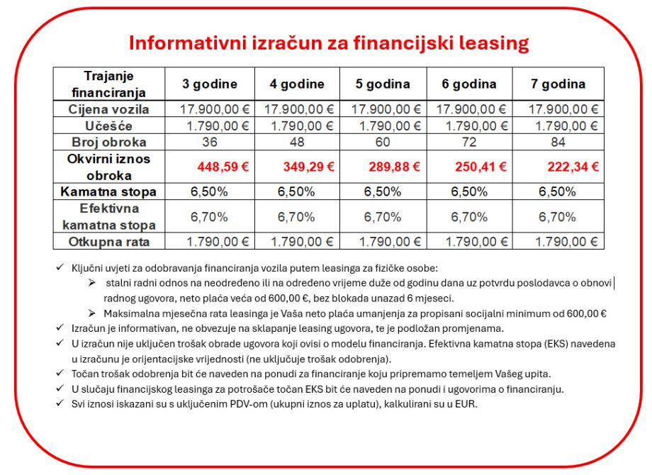 - Leasing (mogućnost leasinga bez učešća) - informativni izračun za predmetno vozilo pogledati u fotografijama