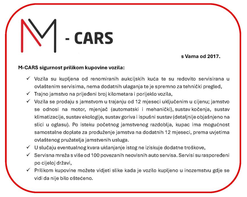 Unatoč pažljivom unosu podataka autokuća M-CARS se unaprijed ispričava za nenamjerne pogreške u opisu vozila. Ukoliko dođe do pogrešaka, iste će biti ispravljene u najkraćem mogućem roku.
