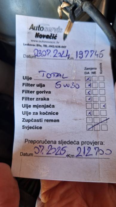 Servisni interval 20.000 km. Poslijednji servis je obavljen 03.07.2024. na 197.745 km. Na 180.414 km obavljen veliki servis kad je između ostalog mijenjan zupčasti remen i prednji diskovi.