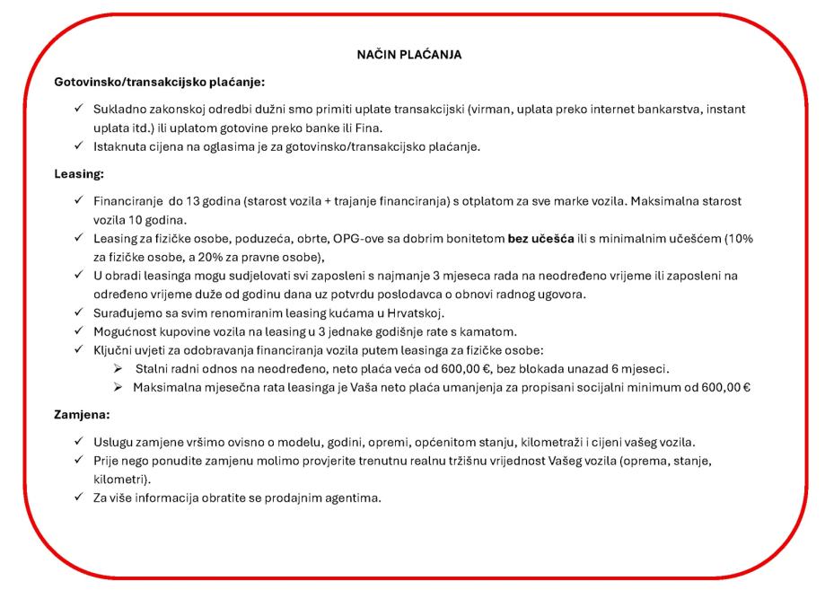- Vozilo je u sustavu PDV-a; navedena cijena je bez PDV-a
