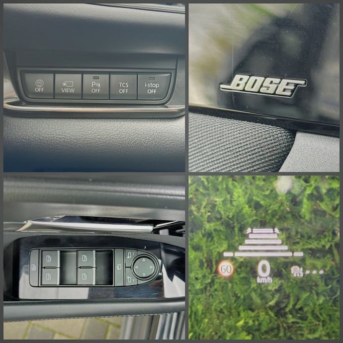 - Full LED adaptivna prednja svjetla, LED stražnja svjetla, Grijanje volana, Grijanje prednjih sjedala, Head-up display, Prednji i stražnji parking senzori, 360 Parking kamera, Navigacija, Keyless-Go, Tempomat, Original Mazda - Alu felge 18", Sustav pomoći vozaču: asistent za duga svjetla, Sustav pomoći vozaču: pomoć u prometnoj traci (praćenje traka), Podešavanje vozačevog i suvozačevog sjedala na struju, Hill holder, Zaslon u boji, Tvornički zatamnjena bočna i stražnje staklo, Komande na volanu, RVM - Senzor mrtvog kuta (na retrovizorima), Volan (sportski/kožni, 3 kraka), Audio kontrola na volanu, Automatska svjetla, Senzor za kišu, Automatska dvozonska klima, Svjetla za maglu, Električno podešavanje retrovizora, Grijanje retrovizora, Električni podizači stakala, Putno računalo, Podesivi stup upravljača, Sustav kontrole tlaka u gumama, Naslon za ruku (prednji+stražnji s držačem za čaše), Unutarnje ogledalo s automatskim zatamnjivanjem, Komplet za popravak guma, Niska emisija u skladu s emisijskim standardom Euro 6, Kožna ručica mjenjača, ISOFIX sustav dječjih sjedala, Preklapanje stražnjih sjedala, Svjetlo pokazivača smjera integrirano u vanjsko ogledalo, Bluetooth sučelje, Univerzalno sučelje (USB / iPod / AUX veza), itd..
