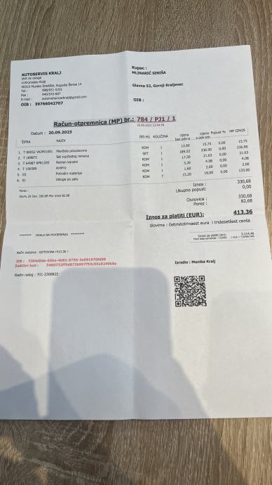 2023. godine na 123000 km napravljen veliki servis, priložim račun.