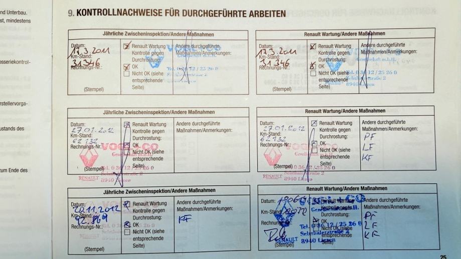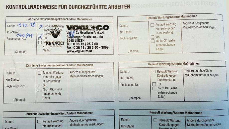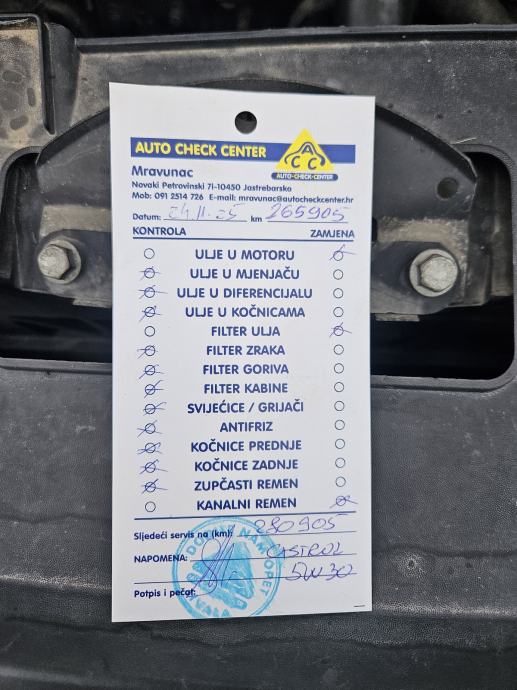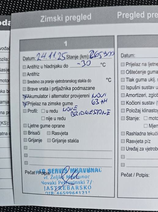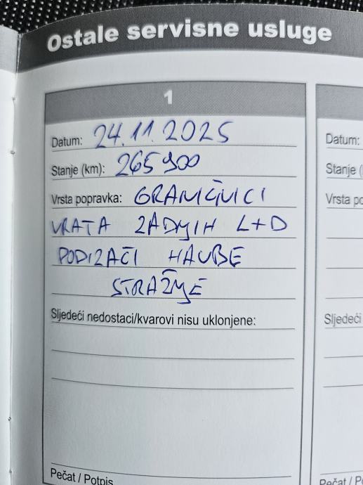 Zadnji redovni servis napravljen 14.04.2025. na 255.091 km, a svježi mali servis 24.11.2025. na 265.905 km sve ovjereno pečatom servisa.