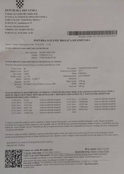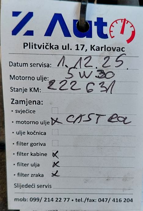 Veliki servis napravljen u 6/2025 na 207000km. Zadnji mali servis napravljen 1.12.2025 na 222600km.