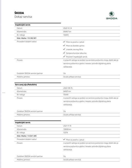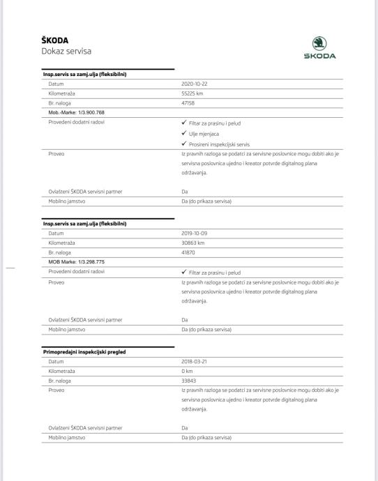 Uredno servisiran i održavan po servisnim intervalima ŠKODA tvornice u ovlaštenom ŠKODA servisu!