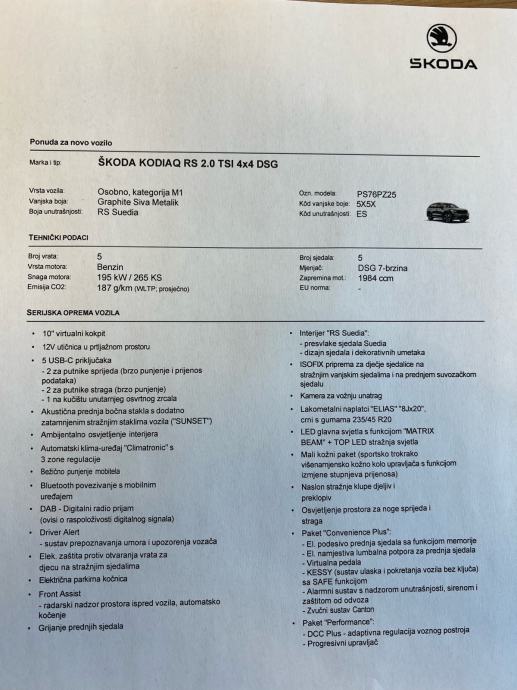 Škoda Kodiaq RS 2.0 TSI 4x4 DSG NOVO 2026, 5 sjedala. Novo vozilo. Jamstvo 6 godina ili 150.000 km. Popis serijske i dodatne opreme u slikama vozila. U sustavu PDV-a. Moguće financiranje putem leasinga. Kontakt: 095/3793-302