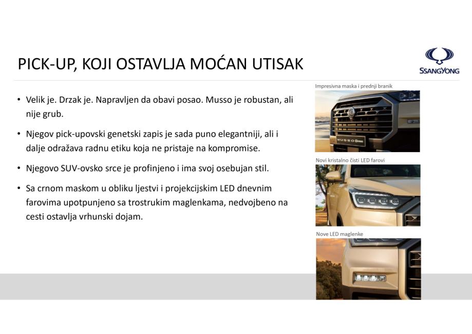 Veličanstveni Musso Grand impresionira svojim sofisticiranim dizajnom i najmodernijom unutrašnjosti koja nudi savršen ambijent, nenadmašnu tehnologiju i vrhunsku udobnost. Posebno impresionira njegov 4x4 pogon koji ne poznaje granice i nevjerojatna vučna sposobnost do 3.000 kg.