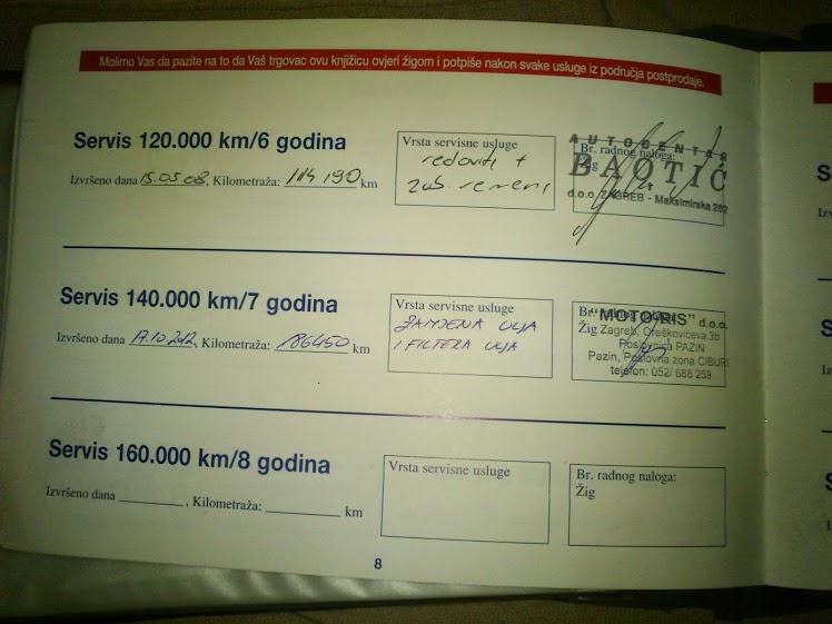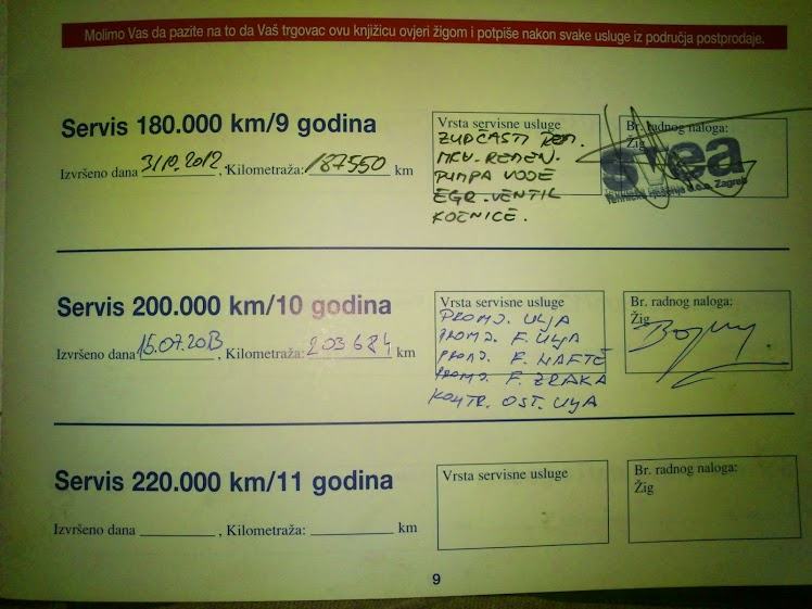 Na cca 204 tkm redovni servis: ulje (Valvoline Syn Power 5W40), filter ulja, filter zraka, filter goriva.
