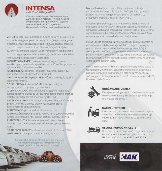 U suradnji s MOTIVE SERVICE EUROPE u cijenu vozila uključeno je INTENSA NAPREDNO AUTO JAMSTVO u trajanju od 12 mjeseci ili do 180.000 km. Jamstvo na: motor, mjenjač, ispušni sustav, sustav napajanja, električni sustav, sustav hlađenja, sustav kočenja, sustav prijenosa, elektronski dijelovi, klima uređaj + HAK asistencija 24/7 sa osiguranim zamjenskim vozilom – (PROČITATI POSLJEDNJU SLIKU U OGLASU).