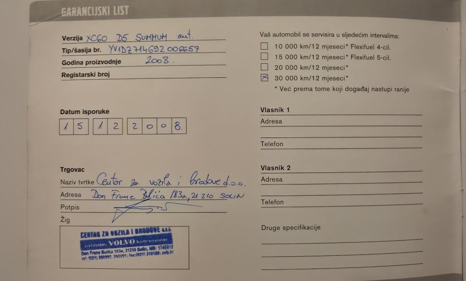 Zadnji veliki servis rađen prije 60.000 (predviđen sljedeći veliki servis za 120.000 km ili 5 godina)
