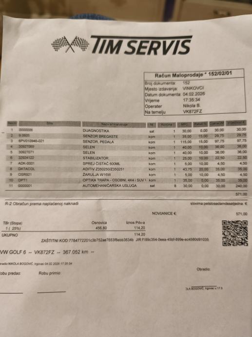 - Napravljen servis ( senzor bregaste, senzor pedala, selen, stabilizator, optike trapa...osobni, SUV),