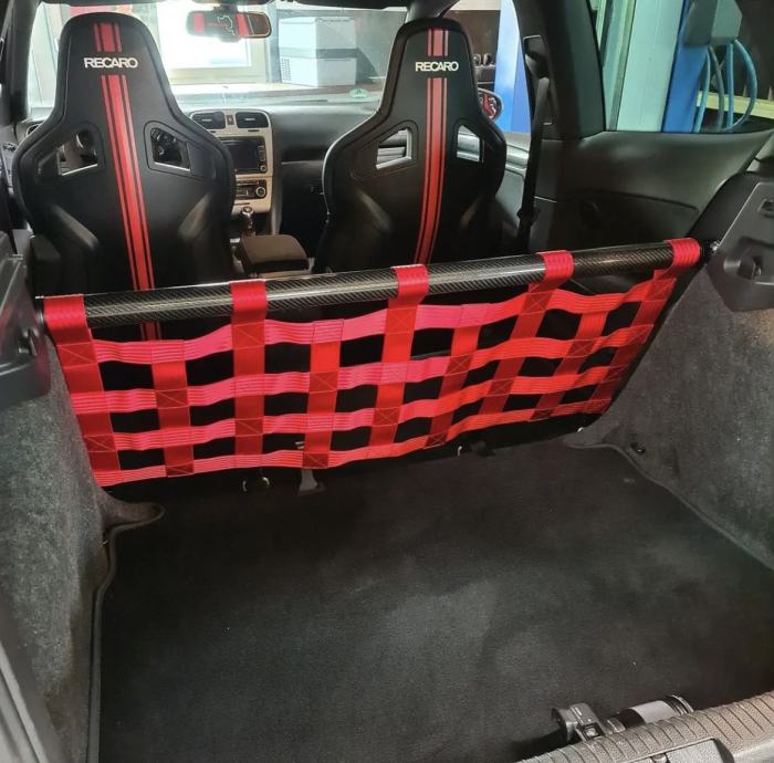 Straga je napravljen seat delete i ugrađena je karbonska šipka sa crvenom mrežom i naravno Clubsport tepih.