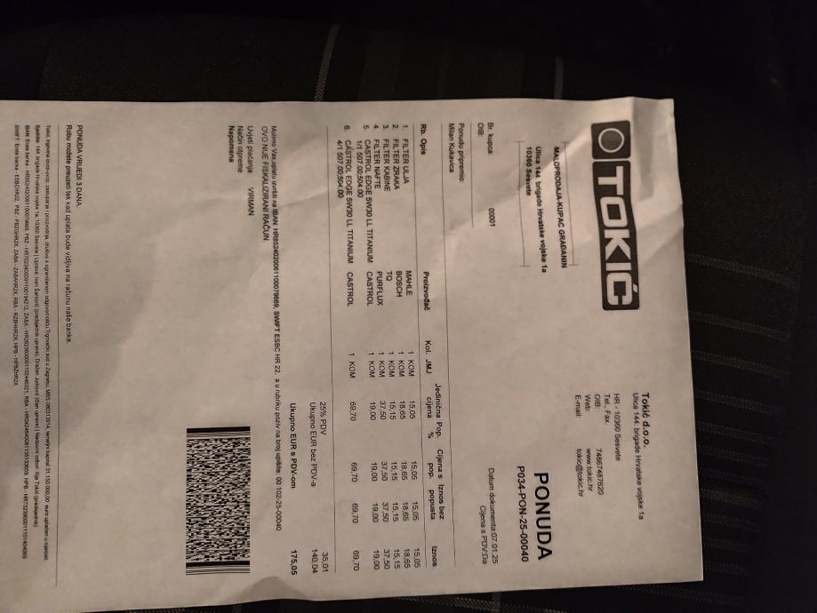 Veliki servis rađen na 213 000 km, komplet mali servis napravljen 10.1.2025, prednji diskovi i pločice zamijenjene na 210000km