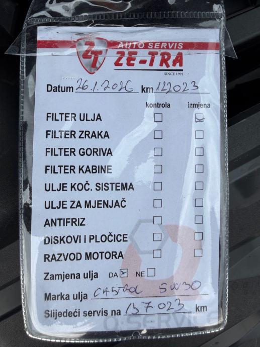 Zadnji servis (mali) napravljen 26.01.2026. na 122.023 km!