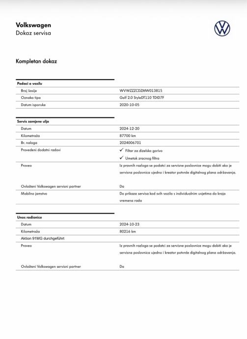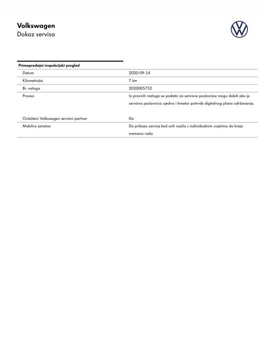- Uredno servisiran i održavan po servisnom planu VW tvornice u ovlaštenom VW servisu