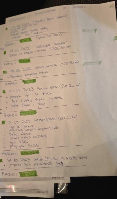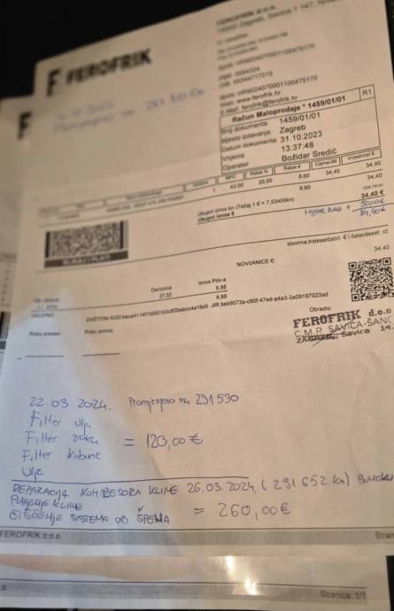 Na njemu je napravljen veliki, i mali servis te među slikama možete pročitati kada je što rađeno na vozilu, a vjerujte bilo je toga dosta u zadnjih cca godinu i pol dana pa do nedavno. Među većim stvarima je i zamjena NOVIH Bosch injektora (ne repariranih več novih), kvačilo, gumice na amortizirati, prednje diskovi i kočione obloge kao i zadnje kočione obloge prednji lijevi homokinetički zglob i obje manžete. Očišćen DPF i zamjenjen EGR kod Pinjušića u Dubravi, zamjenjen hladnjak klime. Ovo ljeto je napravljena reparacija i servis na kompresoru klime i još dosta toga... Auto je zadnjih 8 mjeseci u garaži te je sa njime od tada napravljeno nekih 2000 km. Prije dva mjeseca kupljen i novi start-stop akumulator.
