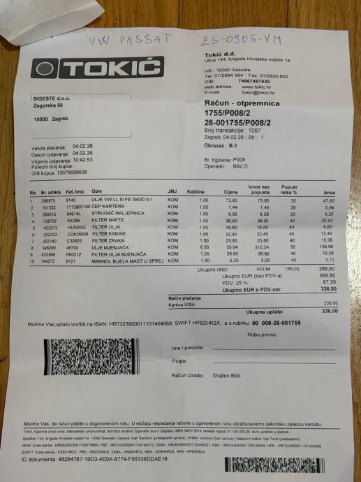 Na vozilu je dana 4.2.2026. na 101.225 km urađen servis: