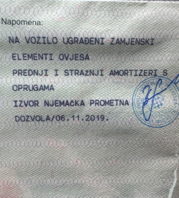 Na vozilu ugrađeni zamjenski elementi ovjesa prednji i stražnji amortizeri s oprugama te je upisano u prometnu dozvolu