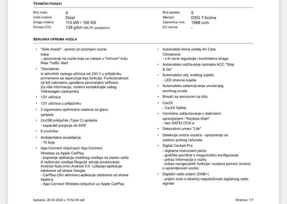 - grijane mlaznice za pranje vjetrobranskog stakla. Auto je kupljen nov u Zubaka, nije uvoz. Automobil je servisiran svakih 15000 km (ne vjerujem u mijenjanje svakih 30000km). Kasko je osiguran. Uz auto dolaze i ljetne i zimske gume. Prodajem ga jer sam naručio novi automobil. Za sve informacije oko pregleda vozila, opreme i cijene slobodno nazovite.