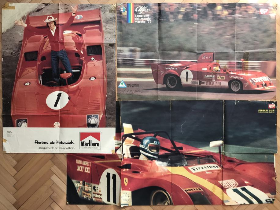 3postera iz autočasopisa: Ferrari i Alfa svjetski prvaci iz1972 i 1975