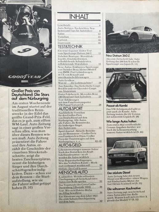 Auto zeitung`74.najava F1 na Nurburgringu na 11str +test: Datsun 260 Z